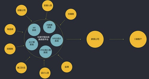 以打扮家為例,通過(guò)打造云端可視化信息系統(tǒng),可以連接設(shè)計(jì)、施工、生產(chǎn)商(經(jīng)銷(xiāo)商)、干線運(yùn)輸、倉(cāng)儲(chǔ)配送、安裝服務(wù)等各環(huán)節(jié),提高整個(gè)生態(tài)圈的信息透明度、流暢度、協(xié)作效率及用戶(hù)體驗(yàn)。